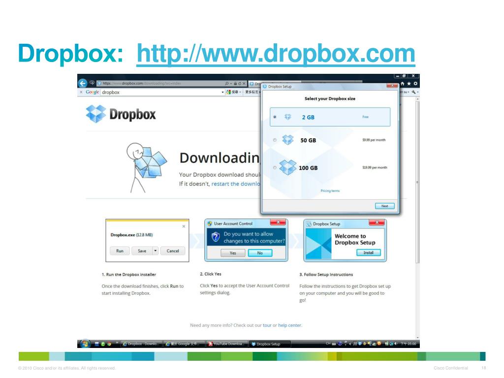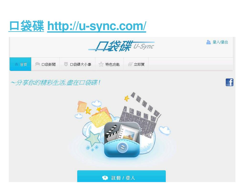 Free Cloud Storage Dropbox (2GB) 口袋碟 (6GB) CHT CloudBox (2GB) Google Drive (5GB) MS SkyDrive (7GB)