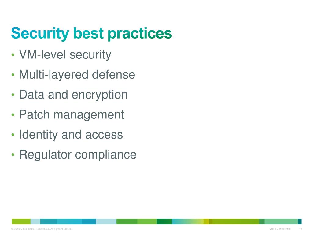Security best practices VM-level security Multi-layered defense Data and encryption Patch management Identity and access Regulator compliance