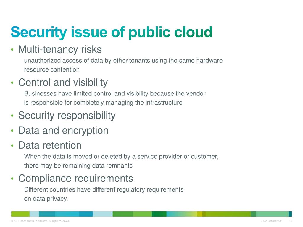 Security issue of public cloud • Multi-tenancy risks • unauthorized access of data by other tenants using the same hardware • resource contention • Control and visibility • Businesses have limited control and visibility because the vendor • is responsible for completely managing the infrastructure • Security responsibility • Data and encryption • Data retention • When the data is moved or deleted by a service provider or customer, • there may be remaining data remnants • Compliance requirements • Different countries have different regulatory requirements • on data privacy.