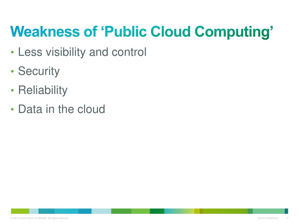 Weakness of ‘Public Cloud Computing’ Less visibility and control Security Reliability Data in the cloud