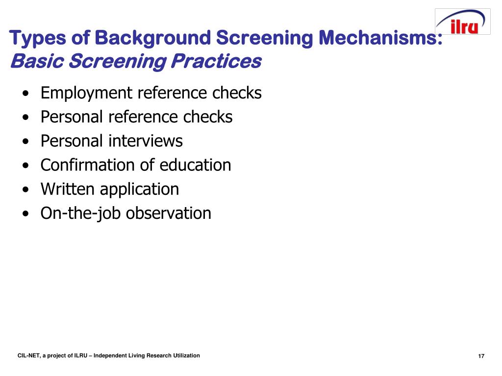 Types of Background Screening Mechanisms:Basic Screening Practices • Employment reference checks • Personal reference checks • Personal interviews • Confirmation of education • Written application • On-the-job observation