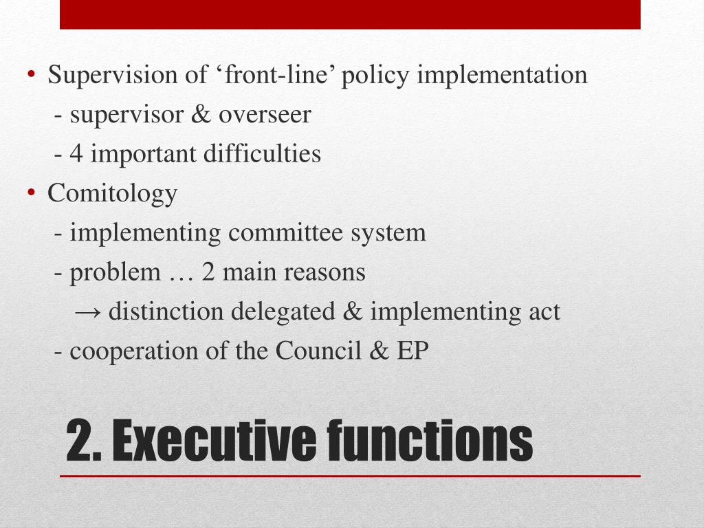 Supervision of ‘front-line’ policy implementation - supervisor & overseer - 4 important difficulties • Comitology - implementing committee system - problem … 2 main reasons → distinction delegated & implementing act - cooperation of the Council & EP 2. Executive functions