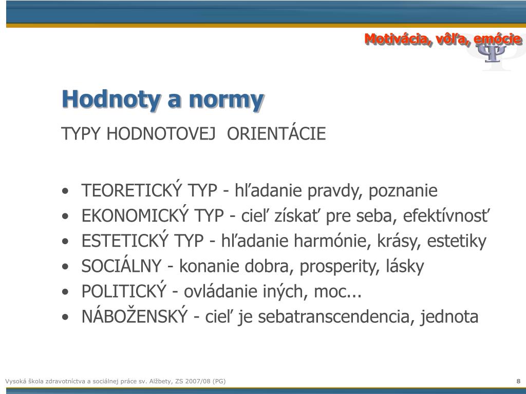 Motivácia, vôľa, emócie Hodnoty a normy TYPY HODNOTOVEJ ORIENTÁCIE • TEORETICKÝ TYP - hľadanie pravdy, poznanie • EKONOMICKÝ TYP - cieľ získať pre seba, efektívnosť • ESTETICKÝ TYP - hľadanie harmónie, krásy, estetiky • SOCIÁLNY - konanie dobra, prosperity, lásky • POLITICKÝ - ovládanie iných, moc... • NÁBOŽENSKÝ - cieľ je sebatranscendencia, jednota Vysoká škola zdravotníctva a sociálnej práce sv. Alžbety, ZS 2007/08 (PG)
