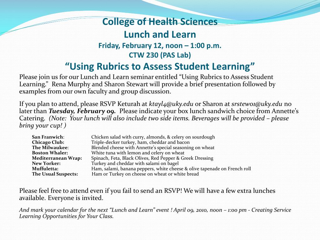 College of Health Sciences Lunch and LearnFriday, February 12, noon – 1:00 p.m.CTW 230 (PAS Lab)“Using Rubrics to Assess Student Learning” Please join us for our Lunch and Learn seminar entitled “Using Rubrics to Assess Student Learning.” Rena Murphy and Sharon Stewart will provide a brief presentation followed by examples from our own faculty and group discussion. If you plan to attend, please RSVP Keturah at ktayl4@uky.edu or Sharon at srstew01@uky.edu no later than Tuesday, February 09. Please indicate your box lunch sandwich choice from Annette’s Catering. (Note: Your lunch will also include two side items. Beverages will be provided – please bring your cup! ) San Franwich: Chicken salad with curry, almonds, & celery on sourdough Chicago Club: Triple-decker turkey, ham, cheddar and bacon The Milwaukee: Blended cheese with Annette’s special seasoning on wheat Boston Whaler: White tuna with lemon and celery on wheat Mediterranean Wrap: Spinach, Feta, Black Olives, Red Pepper & Greek Dressing New Yorker: Turkey and cheddar with salami on bagel Muffuletta: Ham, salami, banana peppers, white cheese & olive tapenade on French roll The Usual Suspects: Ham or Turkey on cheese on wheat or white bread Please feel free to attend even if you fail to send an RSVP! We will have a few extra lunches available. Everyone is invited. And mark your calendar for the next “Lunch and Learn” event ! April 09, 2010, noon – 1:00 pm - Creating Service Learning Opportunities for Your Class.