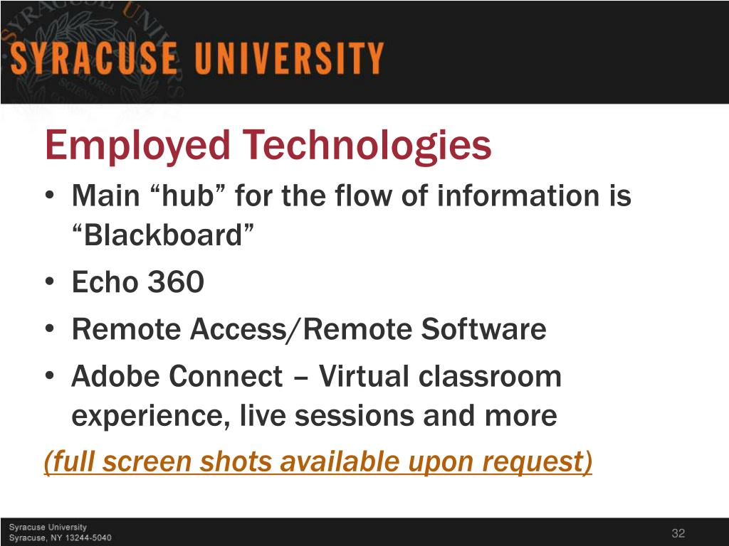 Employed Technologies • Main “hub” for the flow of information is “Blackboard” • Echo 360 • Remote Access/Remote Software • Adobe Connect – Virtual classroom experience, live sessions and more (full screen shots available upon request)