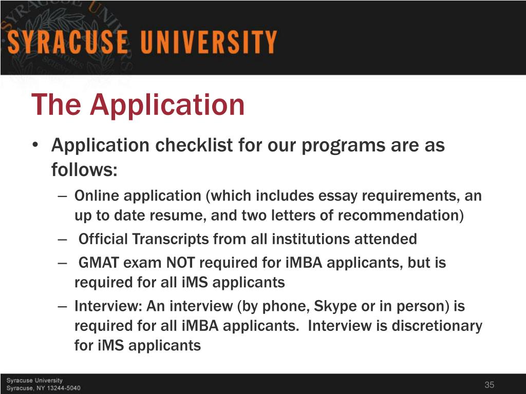 The Application • Application checklist for our programs are as follows: • Online application (which includes essay requirements, an up to date resume, and two letters of recommendation) • Official Transcripts from all institutions attended • GMAT exam NOT required for iMBA applicants, but is required for all iMS applicants • Interview: An interview (by phone, Skype or in person) is required for all iMBA applicants. Interview is discretionary for iMS applicants