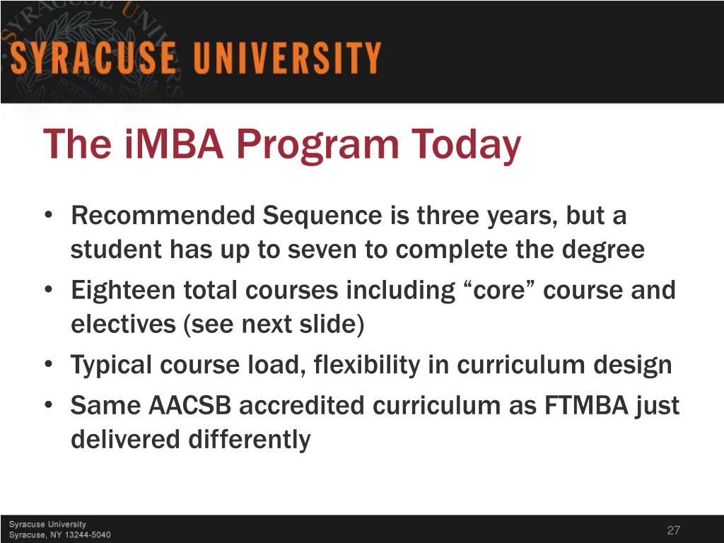 The iMBA Program Today • Recommended Sequence is three years, but a student has up to seven to complete the degree • Eighteen total courses including “core” course and electives (see next slide) • Typical course load, flexibility in curriculum design • Same AACSB accredited curriculum as FTMBA just delivered differently