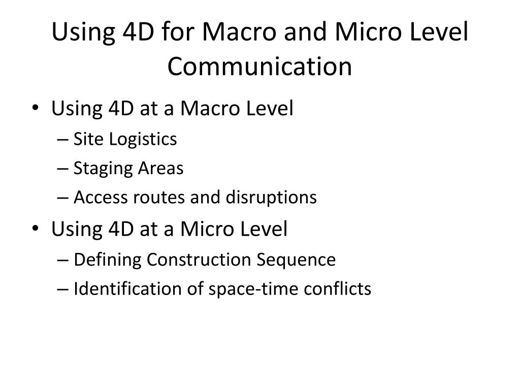 Using 4D for Macro and Micro Level Communication • Using 4D at a Macro Level • Site Logistics • Staging Areas • Access routes and disruptions • Using 4D at a Micro Level • Defining Construction Sequence • Identification of space-time conflicts