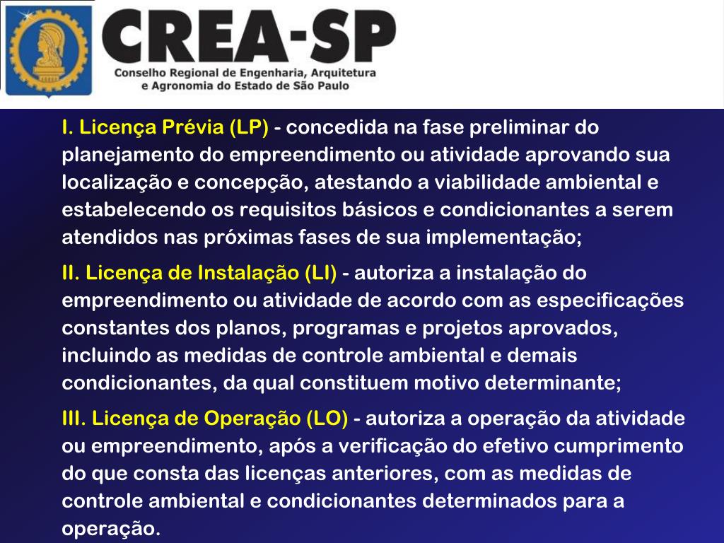 I. Licença Prévia (LP) - concedida na fase preliminar do planejamento do empreendimento ou atividade aprovando sua localização e concepção, atestando a viabilidade ambiental e estabelecendo os requisitos básicos e condicionantes a serem atendidos nas próximas fases de sua implementação; II. Licença de Instalação (LI) - autoriza a instalação do empreendimento ou atividade de acordo com as especificações constantes dos planos, programas e projetos aprovados, incluindo as medidas de controle ambiental e demais condicionantes, da qual constituem motivo determinante; III. Licença de Operação (LO) - autoriza a operação da atividade ou empreendimento, após a verificação do efetivo cumprimento do que consta das licenças anteriores, com as medidas de controle ambiental e condicionantes determinados para a operação.