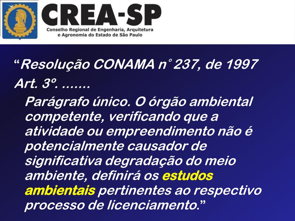 “Resolução CONAMA n° 237, de 1997 Art. 3º. ....... Parágrafo único. O órgão ambiental competente, verificando que a atividade ou empreendimento não é potencialmente causador de significativa degradação do meio ambiente, definirá os estudos ambientais pertinentes ao respectivo processo de licenciamento.”