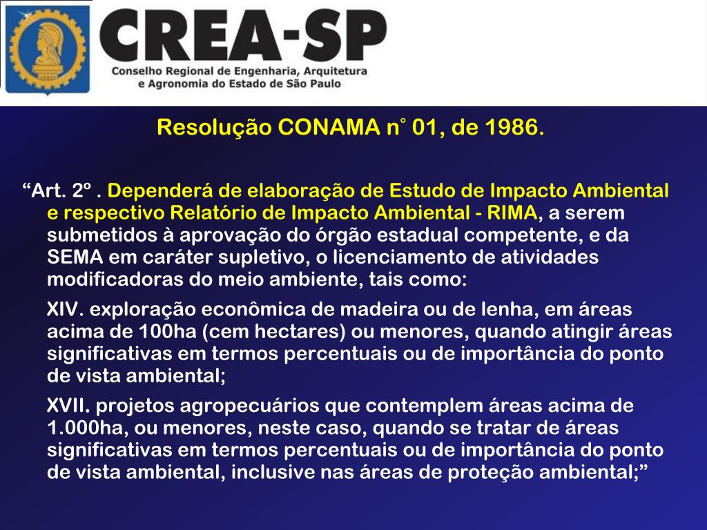 Resolução CONAMA n° 01, de 1986. “Art. 2º . Dependerá de elaboração de Estudo de Impacto Ambiental e respectivo Relatório de Impacto Ambiental - RIMA, a serem submetidos à aprovação do órgão estadual competente, e da SEMA em caráter supletivo, o licenciamento de atividades modificadoras do meio ambiente, tais como: XIV. exploração econômica de madeira ou de lenha, em áreas acima de 100ha (cem hectares) ou menores, quando atingir áreas significativas em termos percentuais ou de importância do ponto de vista ambiental; XVII. projetos agropecuários que contemplem áreas acima de 1.000ha, ou menores, neste caso, quando se tratar de áreas significativas em termos percentuais ou de importância do ponto de vista ambiental, inclusive nas áreas de proteção ambiental;”