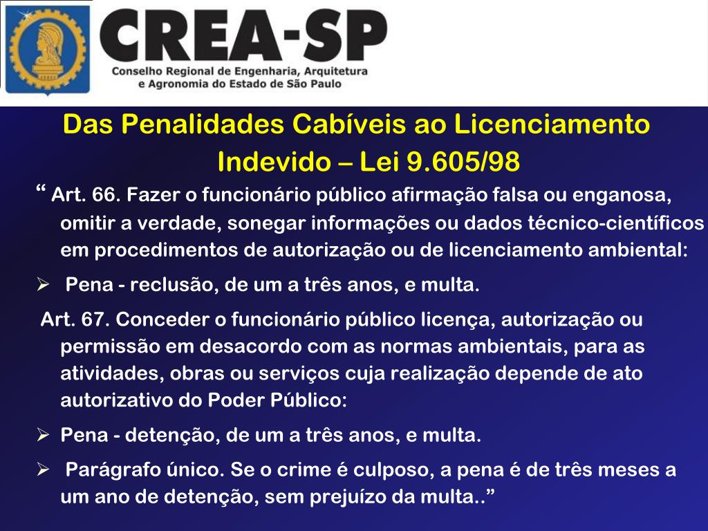 Das Penalidades Cabíveis ao Licenciamento Indevido – Lei 9.605/98 “ Art. 66. Fazer o funcionário público afirmação falsa ou enganosa, omitir a verdade, sonegar informações ou dados técnico-científicos em procedimentos de autorização ou de licenciamento ambiental: • Pena - reclusão, de um a três anos, e multa. Art. 67. Conceder o funcionário público licença, autorização ou permissão em desacordo com as normas ambientais, para as atividades, obras ou serviços cuja realização depende de ato autorizativo do Poder Público: • Pena - detenção, de um a três anos, e multa. • Parágrafo único. Se o crime é culposo, a pena é de três meses a um ano de detenção, sem prejuízo da multa..”