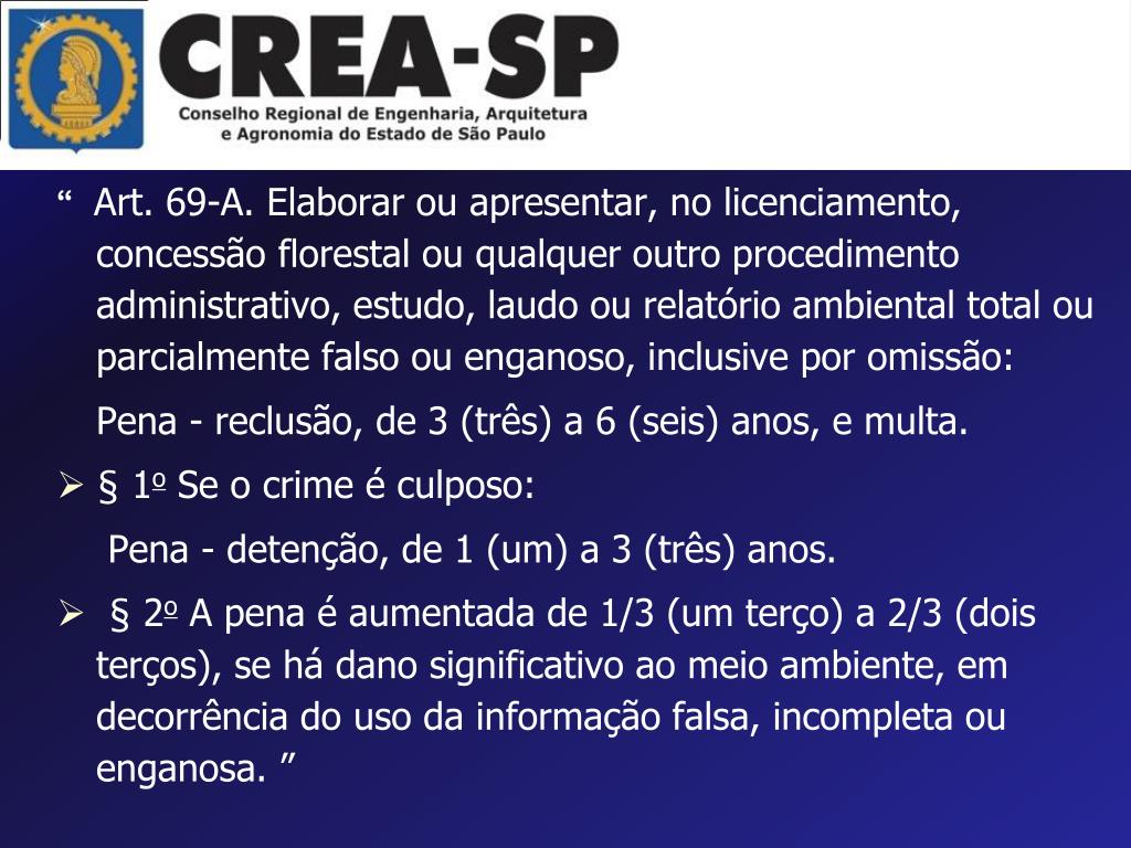 “Art. 69-A. Elaborar ou apresentar, no licenciamento, concessão florestal ou qualquer outro procedimento administrativo, estudo, laudo ou relatório ambiental total ou parcialmente falso ou enganoso, inclusive por omissão: Pena - reclusão, de 3 (três) a 6 (seis) anos, e multa. • § 1o Se o crime é culposo: Pena - detenção, de 1 (um) a 3 (três) anos. • § 2o A pena é aumentada de 1/3 (um terço) a 2/3 (dois terços), se há dano significativo ao meio ambiente, em decorrência do uso da informação falsa, incompleta ou enganosa. ”