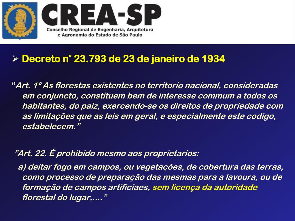 Decreto n° 23.793 de 23 de janeiro de 1934 “Art. 1º As florestas existentes no territorio nacional, consideradas em conjuncto, constituem bem de interesse commum a todos os habitantes, do paiz, exercendo-se os direitos de propriedade com as limitações que as leis em geral, e especialmente este codigo, estabelecem.” ”Art. 22. É prohibido mesmo aos proprietarios: a) deitar fogo em campos, ou vegetações, de cobertura das terras, como processo de preparação das mesmas para a lavoura, ou de formação de campos artificiaes, sem licença da autoridade florestal do lugar,....”