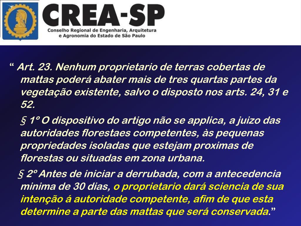 “ Art. 23. Nenhum proprietario de terras cobertas de mattas poderá abater mais de tres quartas partes da vegetação existente, salvo o disposto nos arts. 24, 31 e 52. § 1º O dispositivo do artigo não se applica, a juizo das autoridades florestaes competentes, às pequenas propriedades isoladas que estejam proximas de florestas ou situadas em zona urbana. § 2º Antes de iniciar a derrubada, com a antecedencia minima de 30 dias, o proprietario dará sciencia de sua intenção á autoridade competente, afim de que esta determine a parte das mattas que será conservada.”