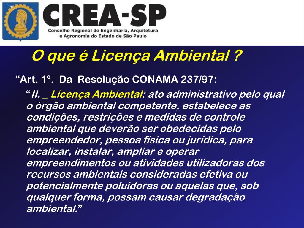 O que é Licença Ambiental ? “Art. 1º. Da Resolução CONAMA 237/97: “II. _ Licença Ambiental: ato administrativo pelo qual o órgão ambiental competente, estabelece as condições, restrições e medidas de controle ambiental que deverão ser obedecidas pelo empreendedor, pessoa física ou jurídica, para localizar, instalar, ampliar e operar empreendimentos ou atividades utilizadoras dos recursos ambientais consideradas efetiva ou potencialmente poluidoras ou aquelas que, sob qualquer forma, possam causar degradação ambiental.”