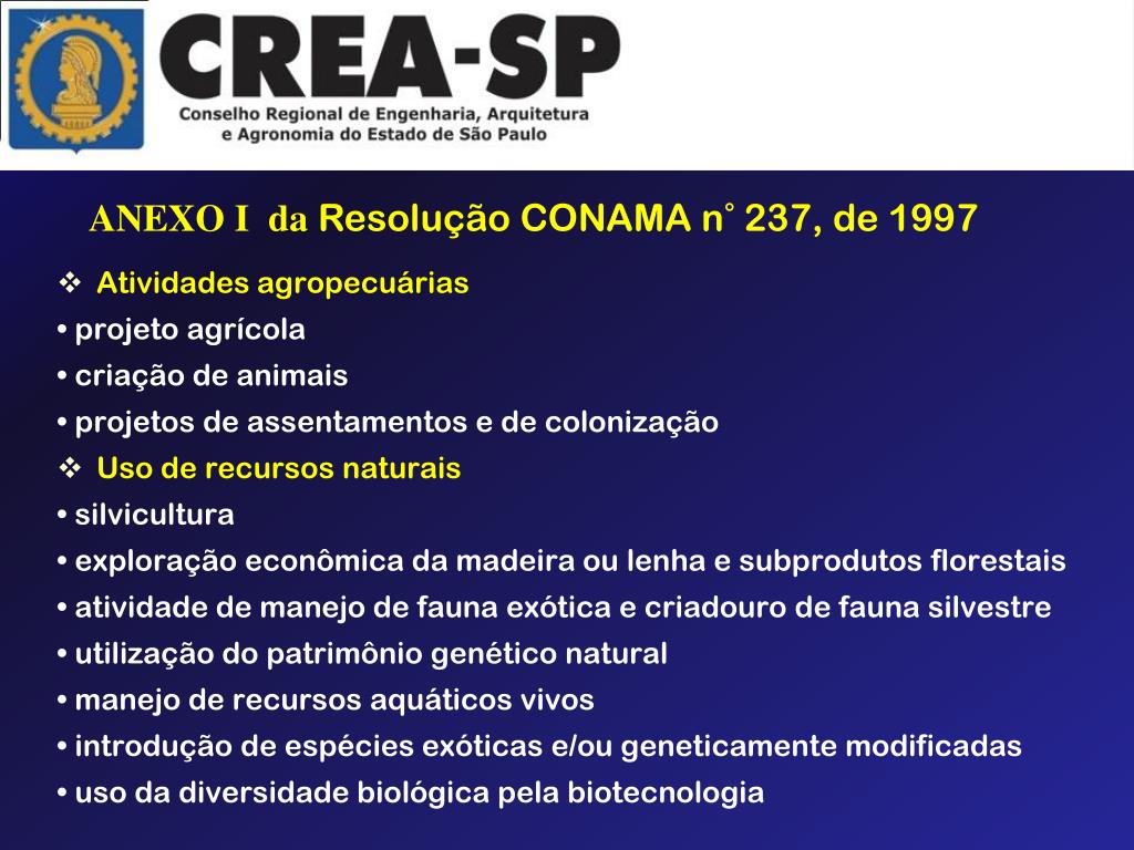ANEXO I da Resolução CONAMA n° 237, de 1997 • Atividades agropecuárias • projeto agrícola • criação de animais • projetos de assentamentos e de colonização • Uso de recursos naturais • silvicultura • exploração econômica da madeira ou lenha e subprodutos florestais • atividade de manejo de fauna exótica e criadouro de fauna silvestre • utilização do patrimônio genético natural • manejo de recursos aquáticos vivos • introdução de espécies exóticas e/ou geneticamente modificadas • uso da diversidade biológica pela biotecnologia