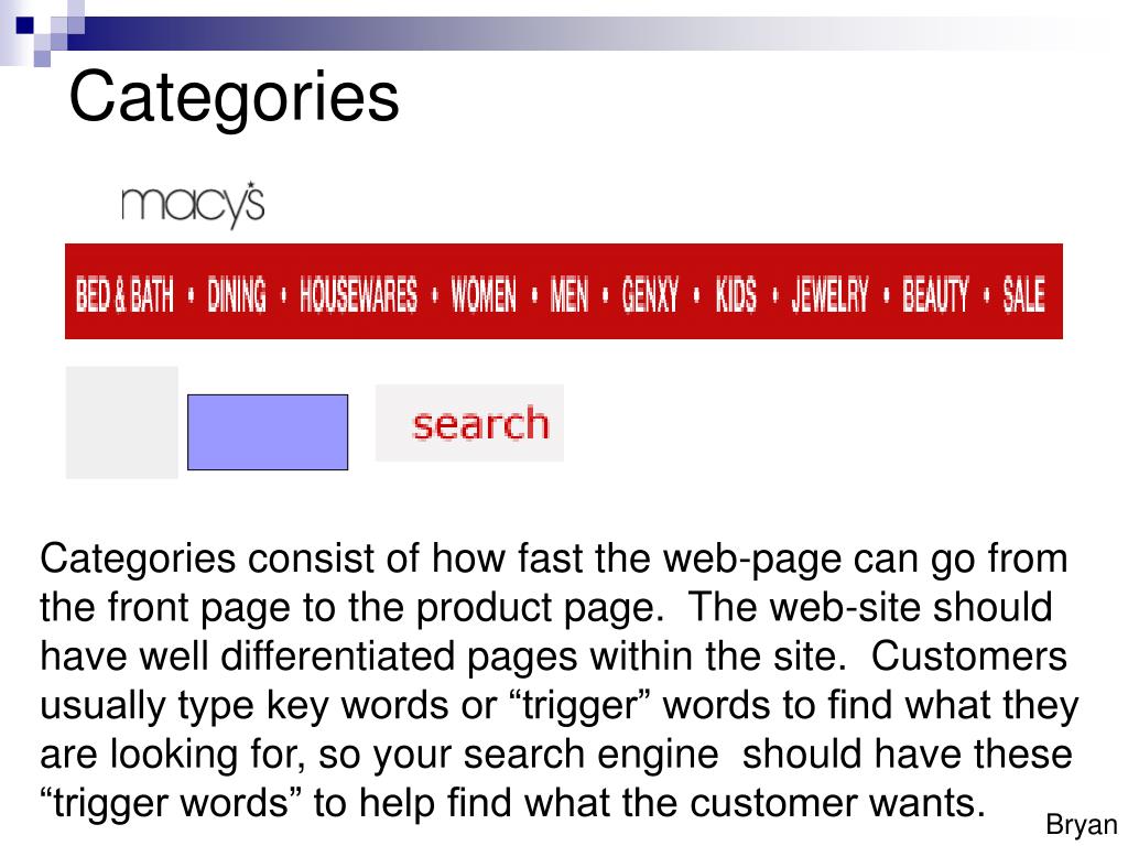 Categories Categories consist of how fast the web-page can go from the front page to the product page. The web-site should have well differentiated pages within the site. Customers usually type key words or “trigger” words to find what they are looking for, so your search engine should have these “trigger words” to help find what the customer wants. Bryan