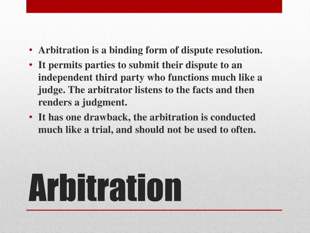 Arbitration is a binding form of dispute resolution. • It permits parties to submit their dispute to an independent third party who functions much like a judge. The arbitrator listens to the facts and then renders a judgment. • It has one drawback, the arbitration is conducted much like a trial, and should not be used to often. Arbitration