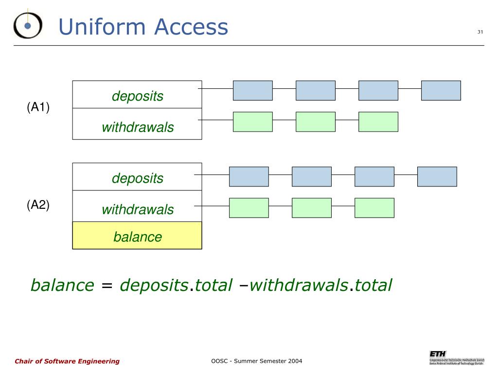 Uniform Access balance = deposits.total –withdrawals.total deposits (A1) withdrawals deposits (A2) withdrawals balance OOSC - Summer Semester 2004