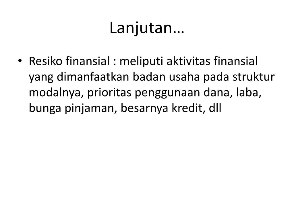 Lanjutan… • Resikofinansial : meliputiaktivitasfinansial yang dimanfaatkanbadanusahapadastrukturmodalnya, prioritaspenggunaandana, laba, bungapinjaman, besarnyakredit, dll