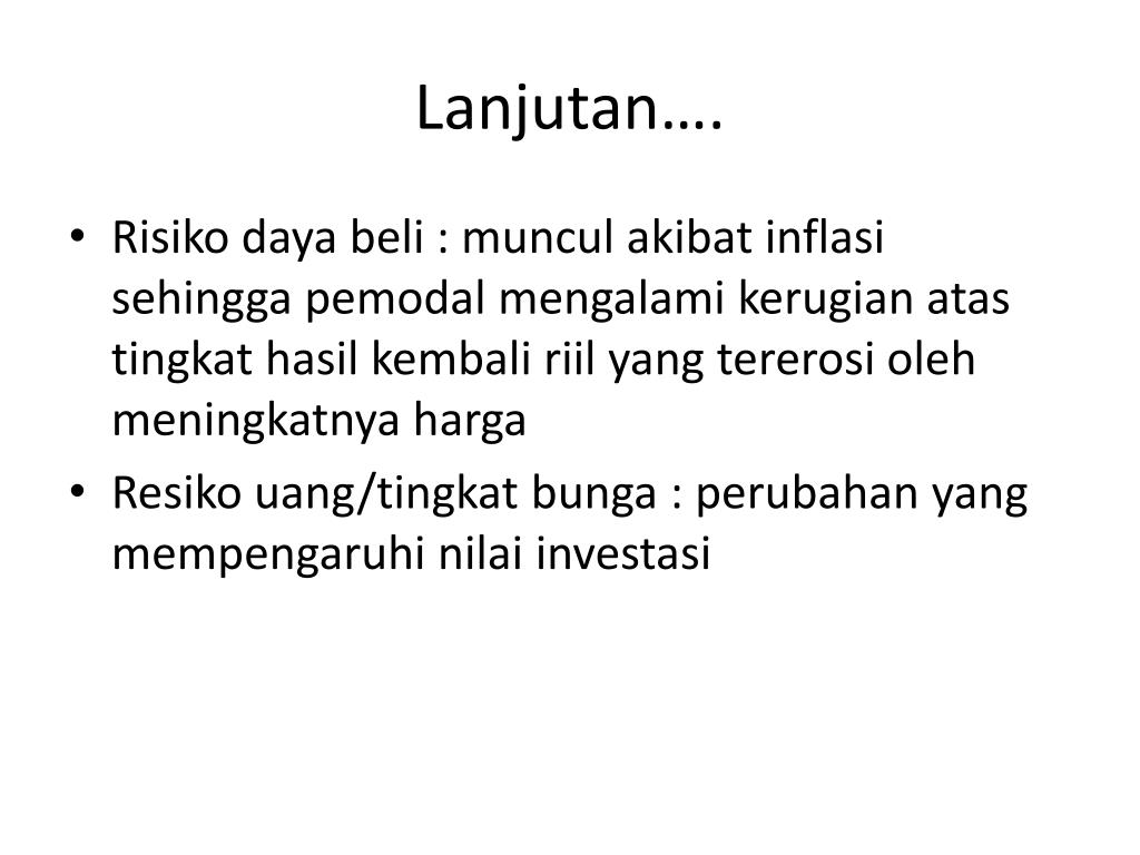 Lanjutan…. • Risikodayabeli : munculakibatinflasisehinggapemodalmengalamikerugianatastingkathasilkembaliriil yang tererosiolehmeningkatnyaharga • Resikouang/tingkatbunga : perubahan yang mempengaruhinilaiinvestasi