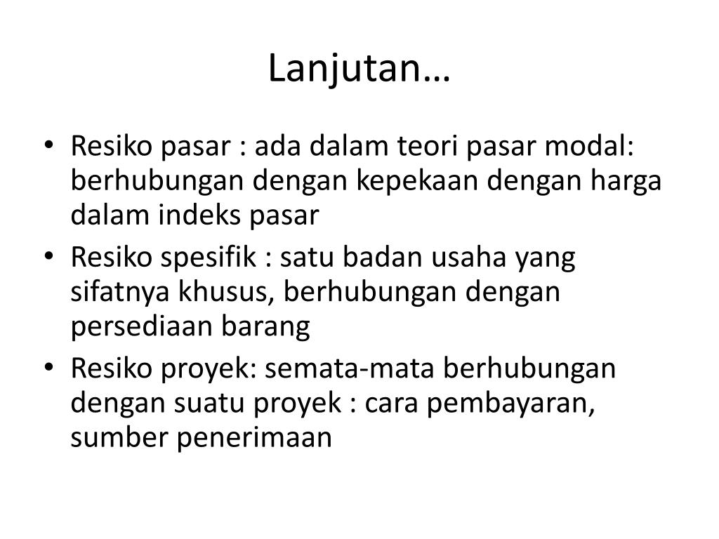 Lanjutan… • Resikopasar : adadalamteoripasar modal: berhubungandengankepekaandenganhargadalamindekspasar • Resikospesifik : satubadanusaha yang sifatnyakhusus, berhubungandenganpersediaanbarang • Resikoproyek: semata-mataberhubungandengansuatuproyek : carapembayaran, sumberpenerimaan