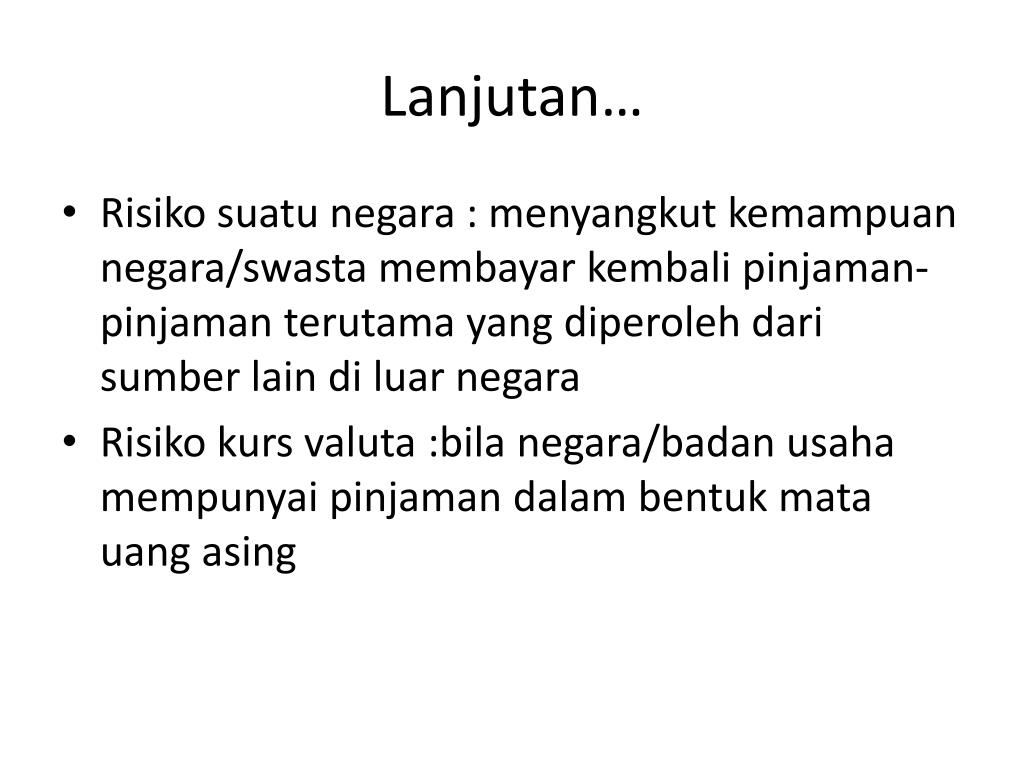 Lanjutan… • Risikosuatunegara : menyangkutkemampuannegara/swastamembayarkembalipinjaman-pinjamanterutama yang diperolehdarisumber lain diluarnegara • Risikokursvaluta :bilanegara/badanusahamempunyaipinjamandalambentukmatauangasing