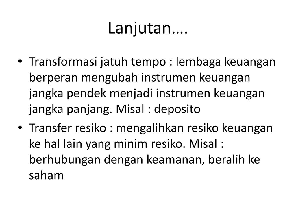 Lanjutan…. • Transformasijatuh tempo : lembagakeuanganberperanmengubahinstrumenkeuanganjangkapendekmenjadiinstrumenkeuanganjangkapanjang. Misal : deposito • Transfer resiko : mengalihkanresikokeuangankehal lain yang minim resiko. Misal : berhubungandengankeamanan, beralihkesaham
