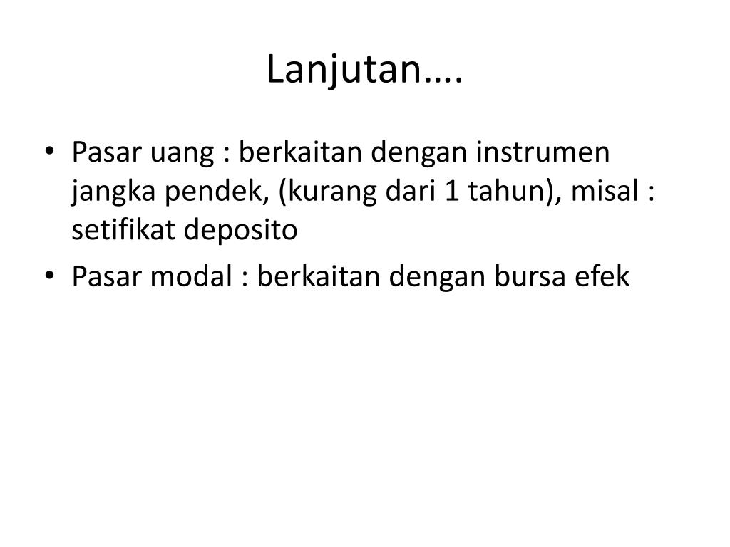 Lanjutan…. • Pasaruang : berkaitandenganinstrumenjangkapendek, (kurangdari 1 tahun), misal : setifikatdeposito • Pasar modal : berkaitandengan bursa efek