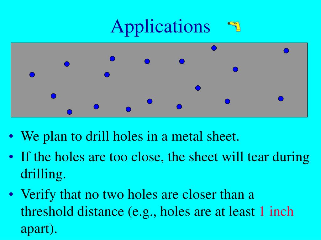 Applications • We plan to drill holes in a metal sheet. • If the holes are too close, the sheet will tear during drilling. • Verify that no two holes are closer than a threshold distance (e.g., holes are at least 1 inch apart).
