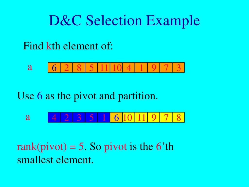 6 2 8 5 11 10 4 1 9 7 3 a a 4 2 3 5 1 4 6 10 11 9 7 8 D&C Selection Example Find kth element of: Use 6 as the pivot and partition. rank(pivot) = 5. So pivot is the 6’th smallest element.
