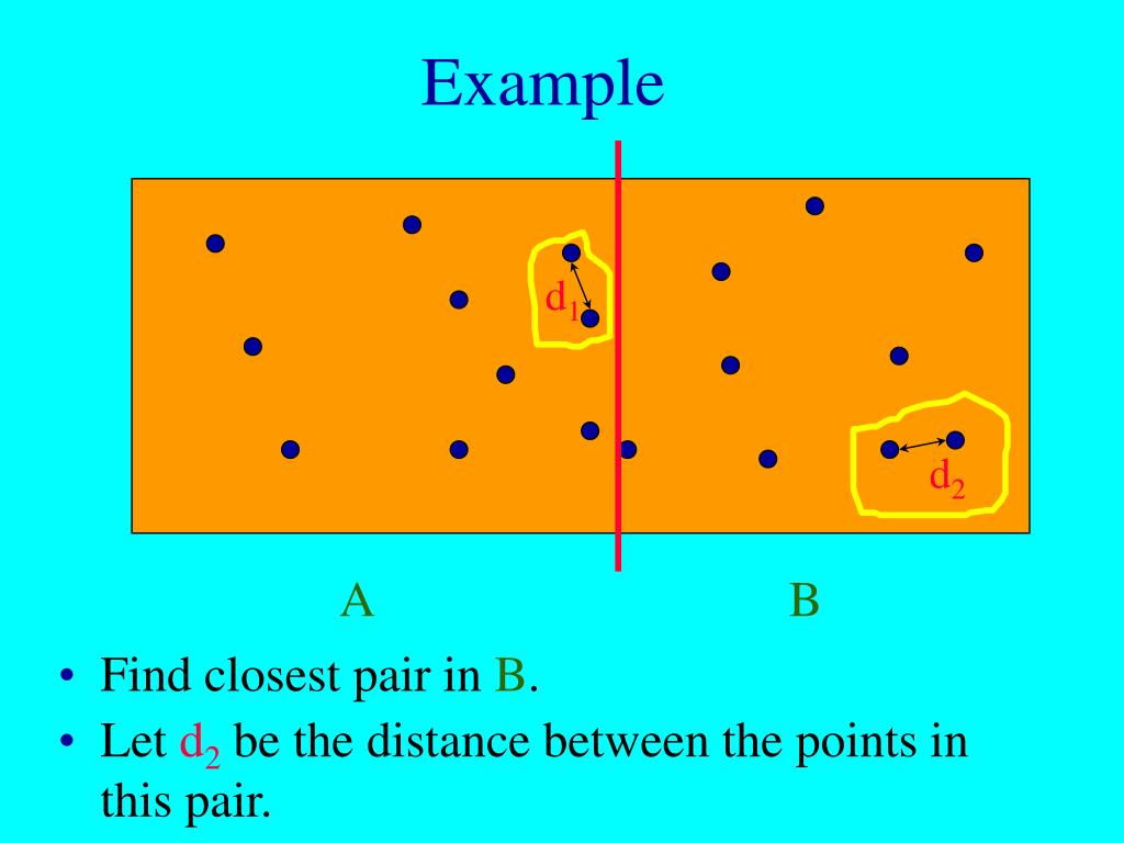 A B Example d1 d2 Find closest pair in B. • Let d2be the distance between the points in this pair.