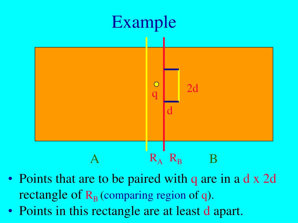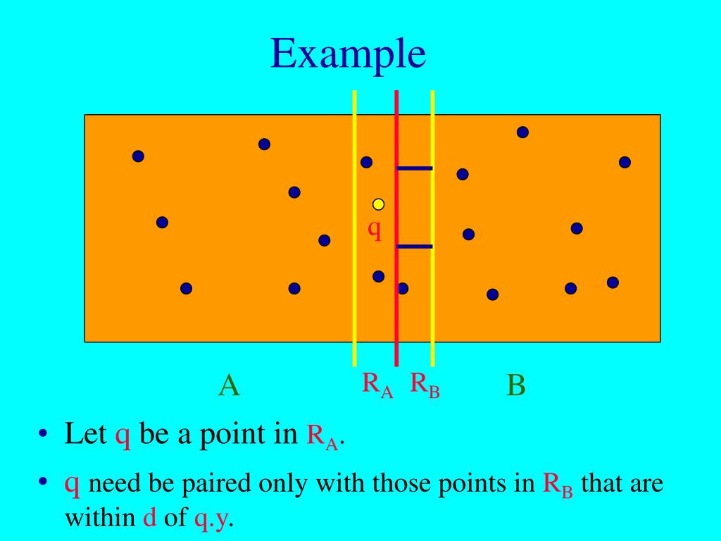 Example 2d q d Points that are to be paired with q are in a d x 2d rectangle of RB (comparing region of q). A RA RB B • Points in this rectangle are at least d apart.