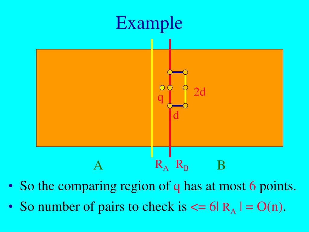 Example 2d q d So the comparing region of q has at most 6 points. A RA RB B • So number of pairs to check is <= 6| RA | = O(n).
