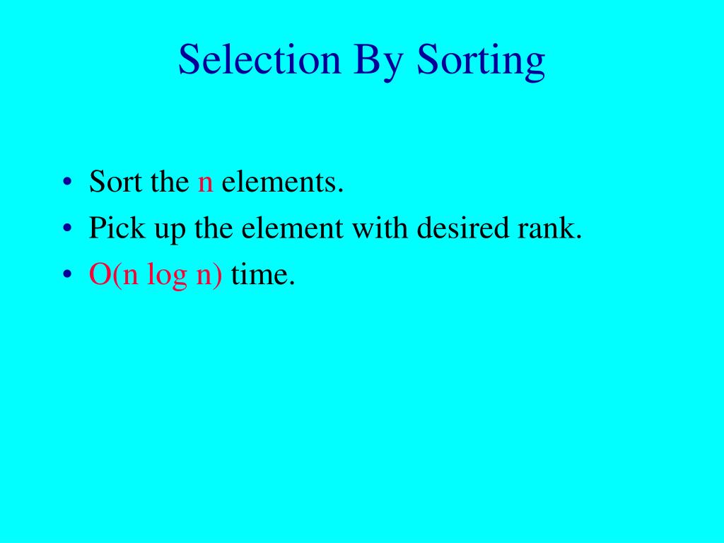Selection By Sorting • Sort the n elements. • Pick up the element with desired rank. • O(n log n) time.