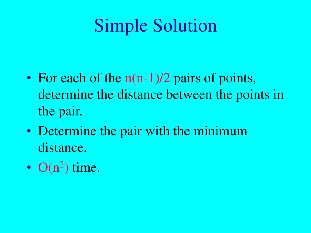 Simple Solution • For each of the n(n-1)/2 pairs of points, determine the distance between the points in the pair. • Determine the pair with the minimum distance. • O(n2) time.