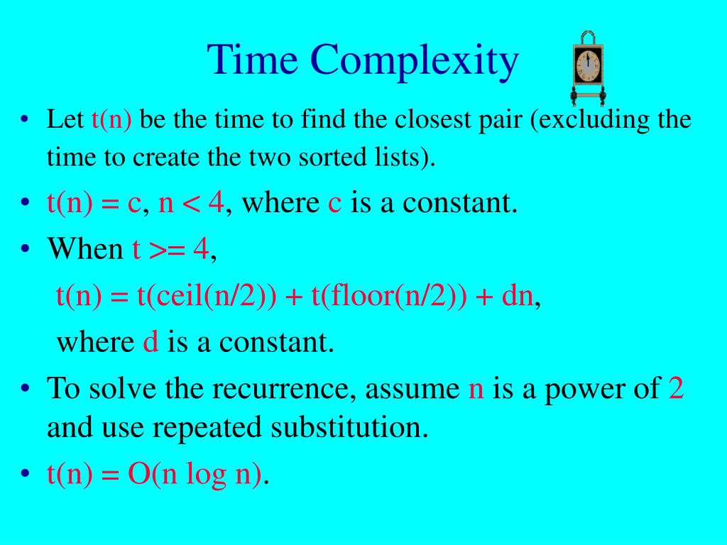 Time Complexity • Let t(n) be the time to find the closest pair (excluding the time to create the two sorted lists). • t(n) = c, n < 4, where c is a constant. • When t >= 4, t(n) = t(ceil(n/2)) + t(floor(n/2)) + dn, where d is a constant. • To solve the recurrence, assume n is a power of 2 anduserepeated substitution. • t(n) = O(n log n).
