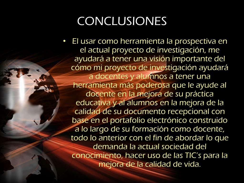 CONCLUSIONES • El usar como herramienta la prospectiva en el actual proyecto de investigación, me ayudará a tener una visión importante del cómo mi proyecto de investigación ayudará a docentes y alumnos a tener una herramienta más poderosa que le ayude al docente en la mejora de su práctica educativa y al alumnos en la mejora de la calidad de su documento recepcional con base en el portafolio electrónico construido a lo largo de su formación como docente, todo lo anterior con el fin de abordar lo que demanda la actual sociedad del conocimiento, hacer uso de las TIC’s para la mejora de la calidad de vida.