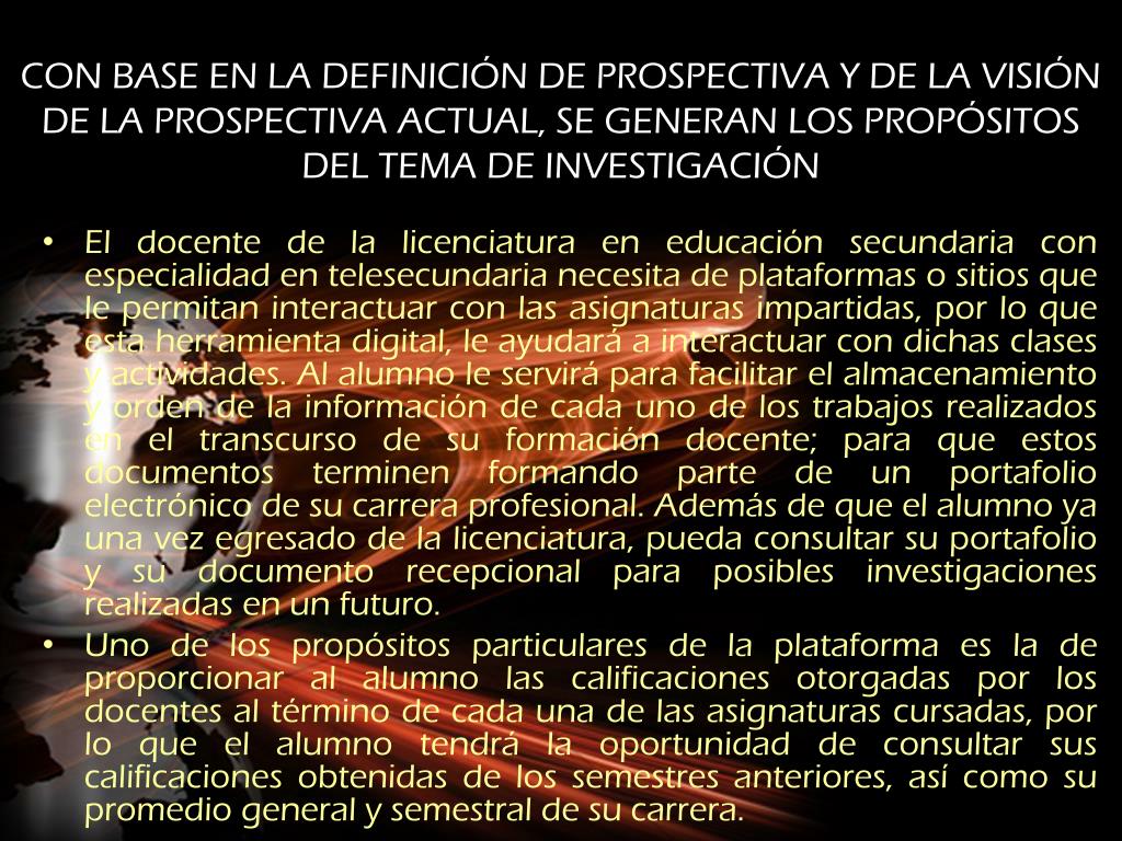 CON BASE EN LA DEFINICIÓN DE PROSPECTIVA Y DE LA VISIÓN DE LA PROSPECTIVA ACTUAL, SE GENERAN LOS PROPÓSITOS DEL TEMA DE INVESTIGACIÓN • El docente de la licenciatura en educación secundaria con especialidad en telesecundaria necesita de plataformas o sitios que le permitan interactuar con las asignaturas impartidas, por lo que esta herramienta digital, le ayudará a interactuar con dichas clases y actividades. Al alumno le servirá para facilitar el almacenamiento y orden de la información de cada uno de los trabajos realizados en el transcurso de su formación docente; para que estos documentos terminen formando parte de un portafolio electrónico de su carrera profesional. Además de que el alumno ya una vez egresado de la licenciatura, pueda consultar su portafolio y su documento recepcional para posibles investigaciones realizadas en un futuro. • Uno de los propósitos particulares de la plataforma es la de proporcionar al alumno las calificaciones otorgadas por los docentes al término de cada una de las asignaturas cursadas, por lo que el alumno tendrá la oportunidad de consultar sus calificaciones obtenidas de los semestres anteriores, así como su promedio general y semestral de su carrera.