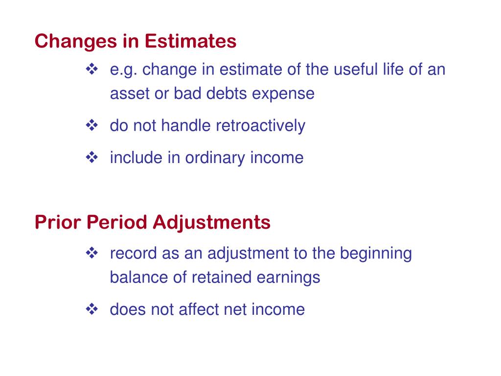 Changes in Estimates • e.g. change in estimate of the useful life of an asset or bad debts expense • do not handle retroactively • include in ordinary income Prior Period Adjustments • record as an adjustment to the beginning balance of retained earnings • does not affect net income