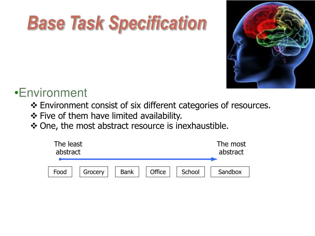 The least abstract The most abstract Food Grocery Bank Office School Sandbox Base Task Specification • Environment • Environment consist of six different categories of resources. • Five of them have limited availability. • One, the most abstract resource is inexhaustible.