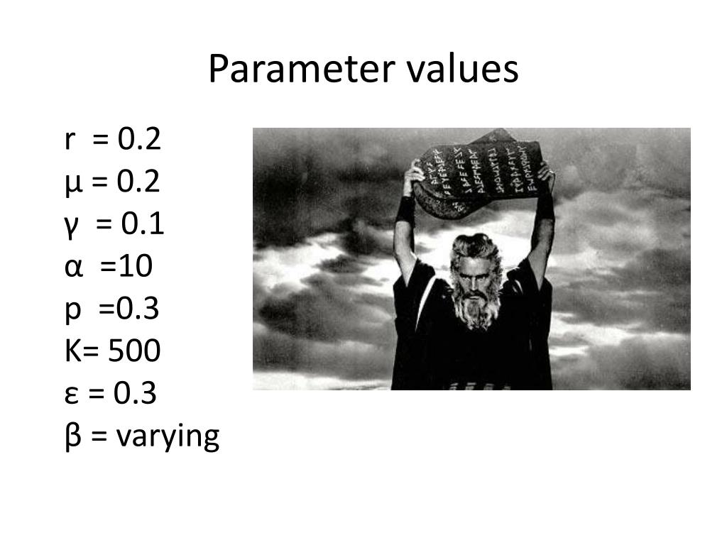 Parametervalues r = 0.2 μ = 0.2 γ = 0.1 α =10 p =0.3 K= 500 ε = 0.3 β = varying