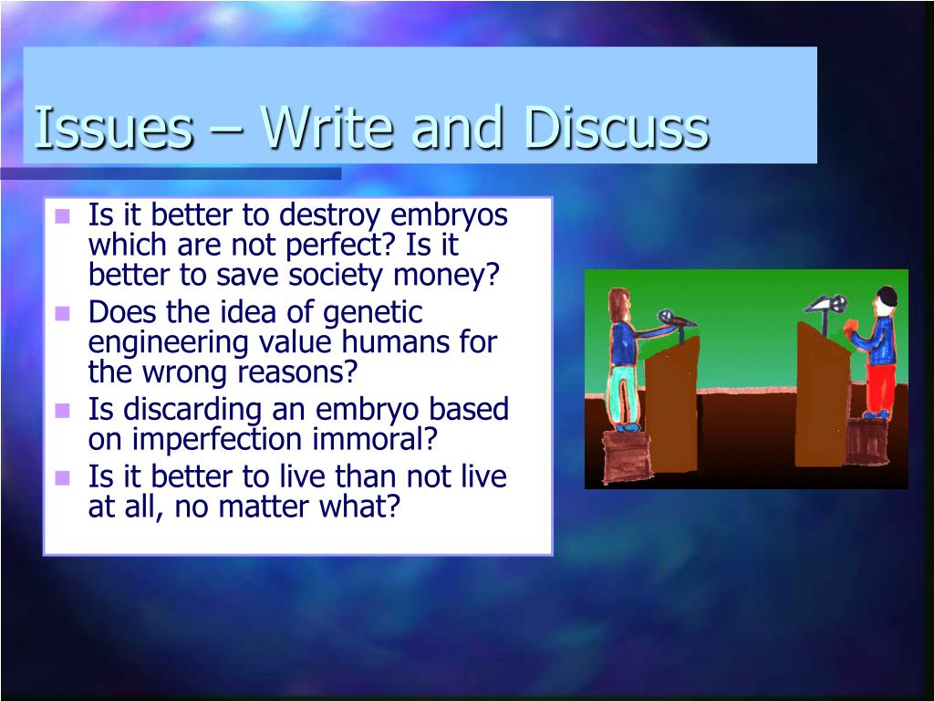 Issues – Write and Discuss • Is it better to destroy embryos which are not perfect? Is it better to save society money? • Does the idea of genetic engineering value humans for the wrong reasons? • Is discarding an embryo based on imperfection immoral? • Is it better to live than not live at all, no matter what?