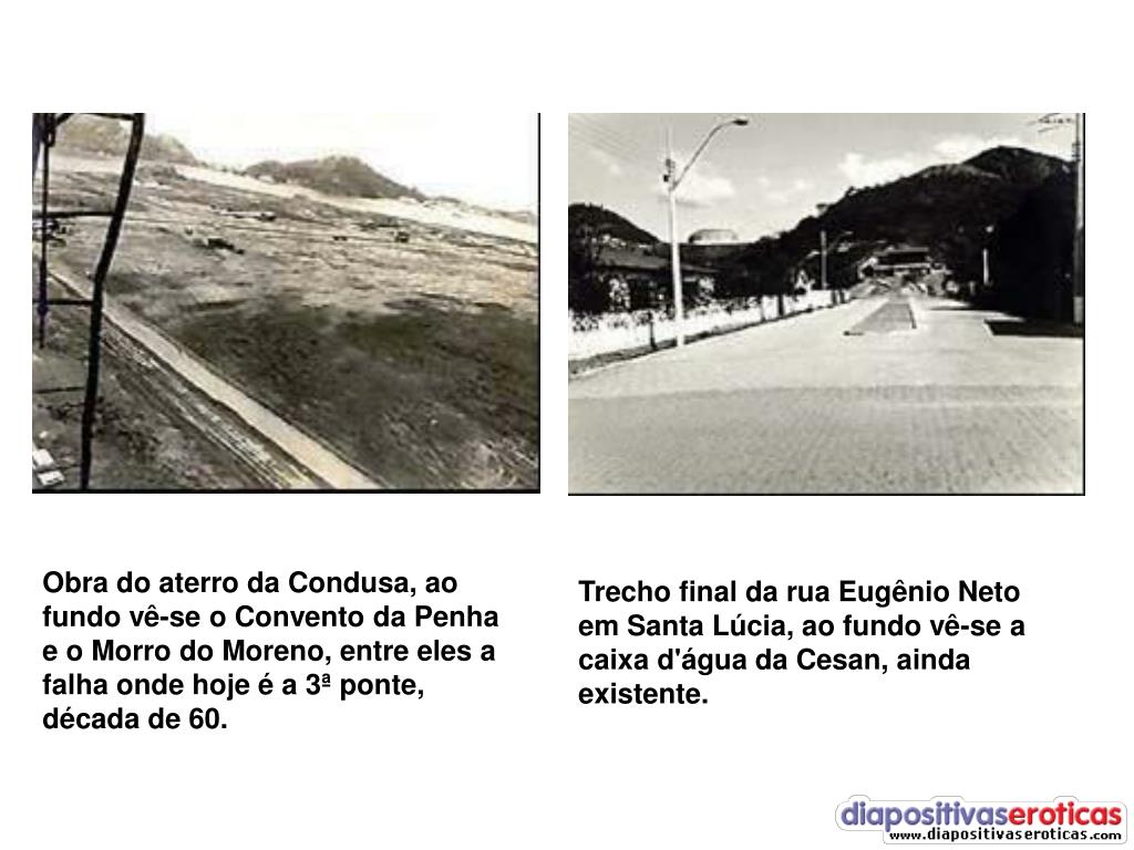 Em primeiro plano, obra de corte da pedreira no final da Reta da Penha, na Ponte da Passagem; ao fundo cava da pedreira da reserva ecológica do Morro do Itapenambi; a esquerda, posto de abastecimento de combustível. Década de 70. Av. Jerônimo Monteiro; vê-se o Cine Juparanã (em primeiro plano) onde funcionou a DIT; os prédios da Cine Glória e do antigo Banco Nacional; considerando-se os veículos, década de 60.