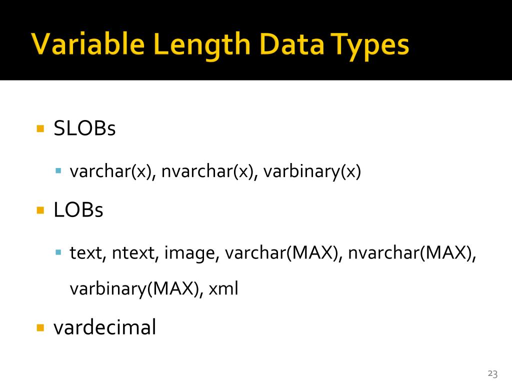 Variable Length Data Types • SLOBs • varchar(x), nvarchar(x), varbinary(x) • LOBs • text, ntext, image, varchar(MAX), nvarchar(MAX), varbinary(MAX), xml • vardecimal