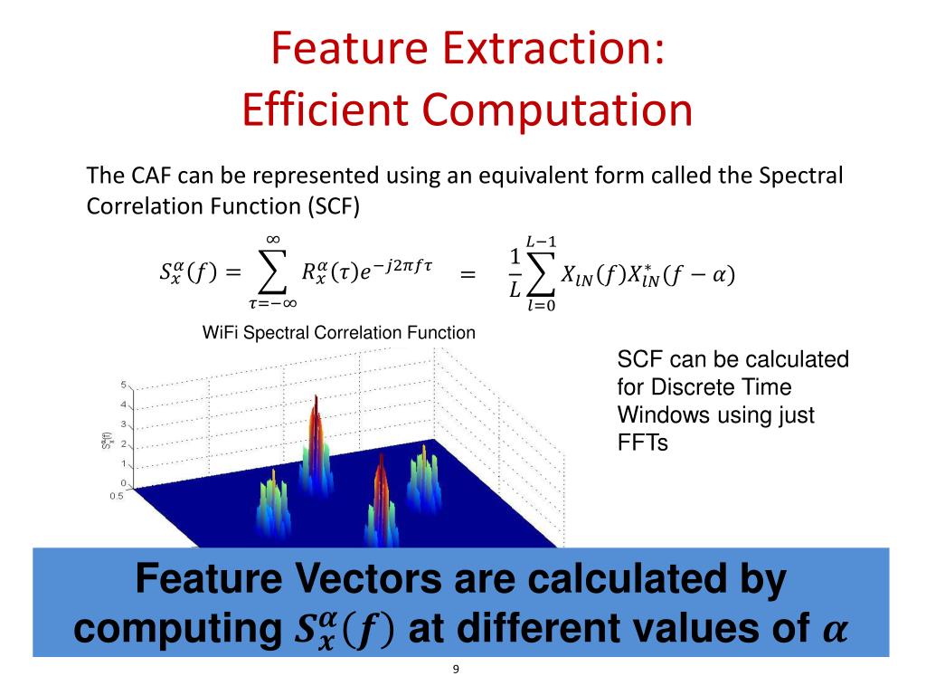 Extracting Features from Patterns • If a signal has a repeating pattern, then when we • Correlate the received signal against itself delayed by a fixed amount, the correlation will peak when the delay is equal to the period at which the pattern repeats. Cyclic Autocorrelation Function (CAF) Pattern Frequency () – The frequency at which the pattern repeats • Advantages • Robustness to noise, • Uniqueness for each protocol Disadvantage: Computationally expensive to calculate the patterns in this manner Delay (τ) Pattern Frequency (α) 8