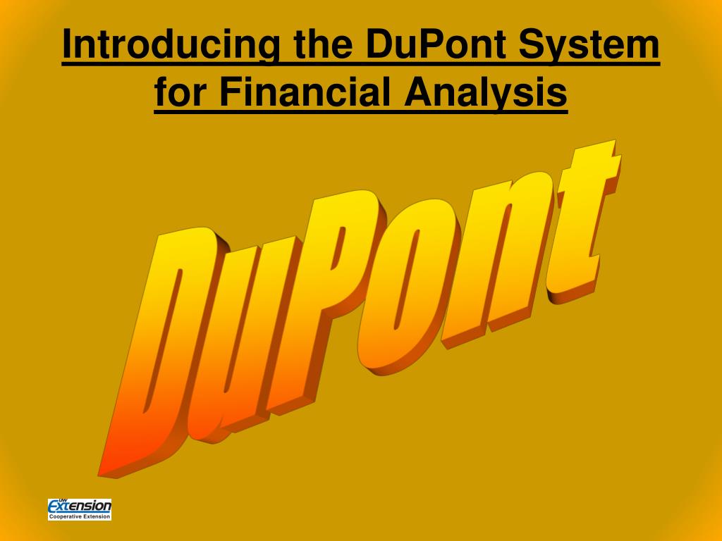 DuPont System • “DuPont Financial Analysis Model is a rather straightforward method for assessing the factors that influence a firm’s financial performance.” (Gunderson, Detre, and Boehlje, AgriMarketing 2005)
