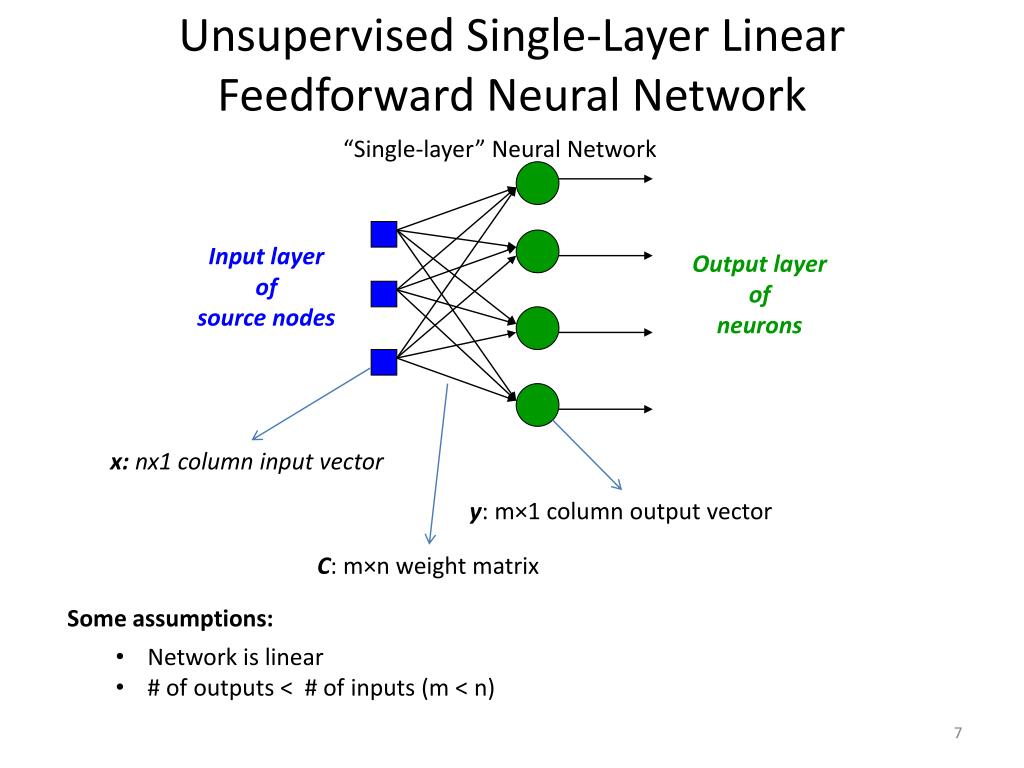 Unsupervised Single-Layer Linear Feedforward Neural Network “Single-layer” Neural Network Input layer of source nodes Output layer of neurons x: nx1 column input vector y: m×1 column output vector Some assumptions: C: m×n weight matrix • Network is linear • # of outputs < # of inputs (m < n)