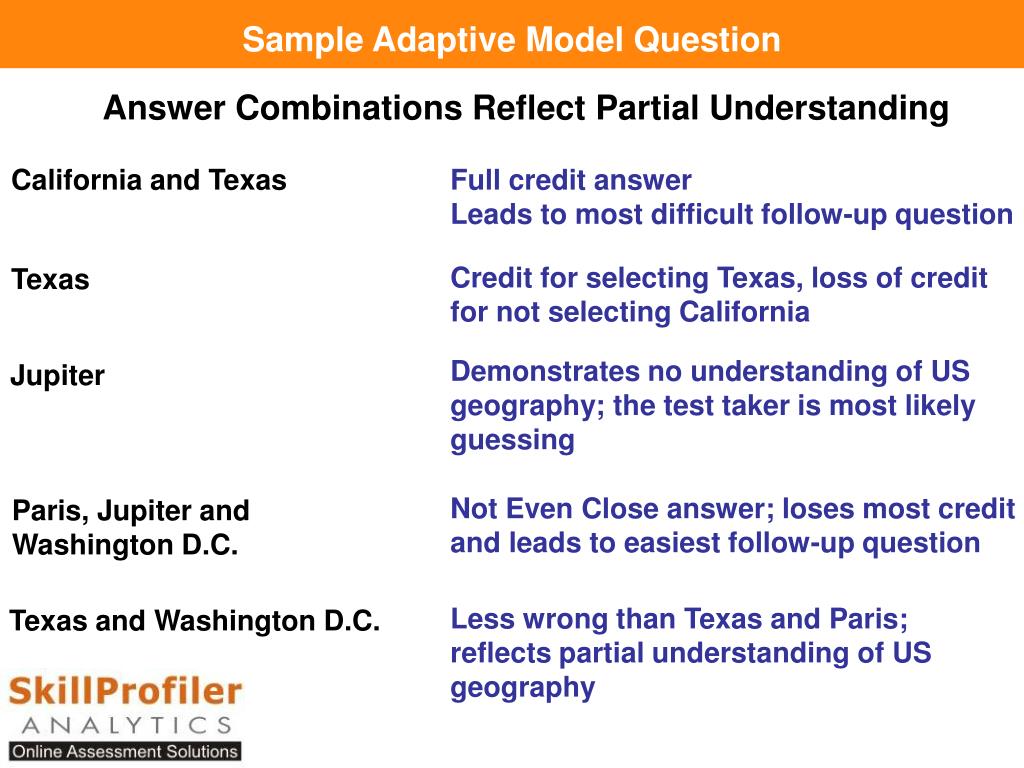 Sample Adaptive Model Question Answer Combinations Reflect Partial Understanding California and Texas Full credit answer Leads to most difficult follow-up question Credit for selecting Texas, loss of credit for not selecting California Texas Demonstrates no understanding of US geography; the test taker is most likely guessing Jupiter Not Even Close answer; loses most credit and leads to easiest follow-up question Paris, Jupiter and Washington D.C. Less wrong than Texas and Paris; reflects partial understanding of US geography Texas and Washington D.C.